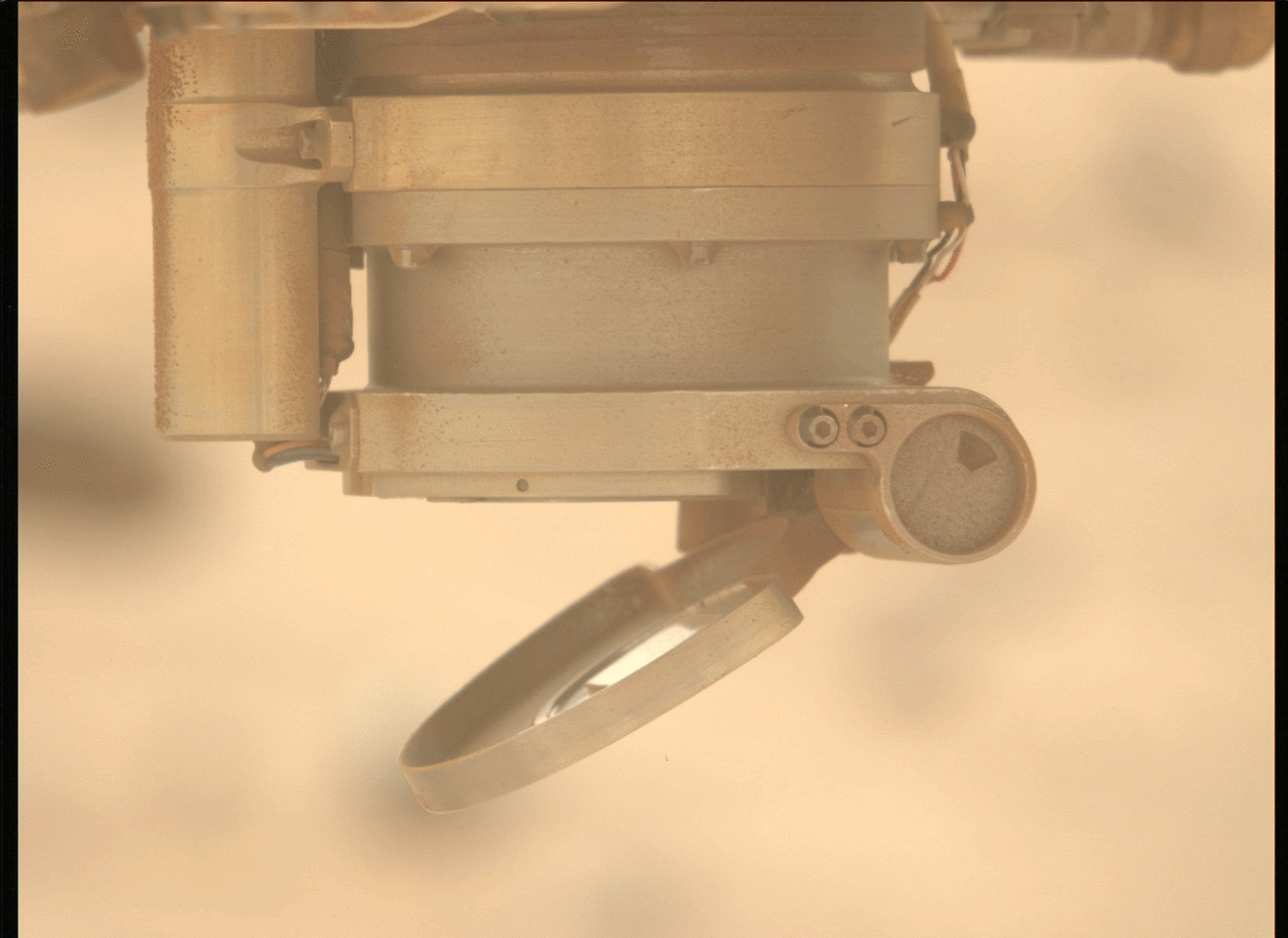 Крышка автофокусного и контекстного устройства SHERLOC - одного из приборов на борту марсохода НАСА Perseverance - движется на снимках, сделанных прибором Mastcam-Z марсохода 11 мая. Credit: NASA/JPL-Caltech/ASU/MSSS