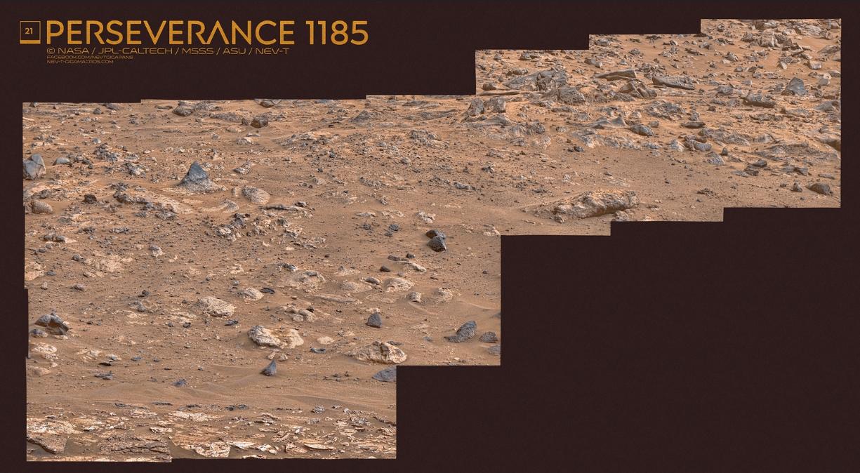 Составное / обработанное плиточное изображение с камеры NavCam с видом на восток в 1195 сол после "Bump" (очень короткой поездки) ровера Perseverance. Расстояние составило всего 33 см (1,1 фута). Я предполагаю, что это было сделано для того, чтобы доставить дополнительные цели в пределы досягаемости роботизированной руки ровера.