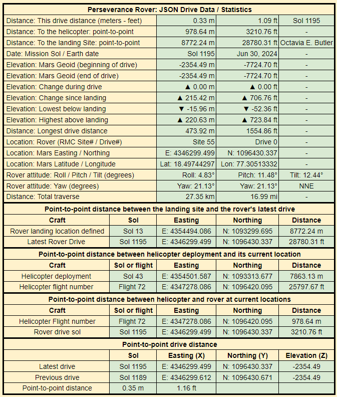 Пол Хаммонд подводит некоторые итоги на 1195 сол пребывания на Марсе (30 июня 2024 г). И отдает должное вертолету, включив его показатели в таблицу.