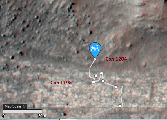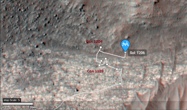 9 июля ( 1204 сол) ровер продвинулся к северу согласно JSON на "dist_m": 14.434, поднялся на ~2,5 метра и оказался здесь: