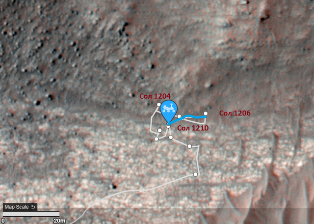 На карте видно, что сегодня (1210 сол) ровер подъехал к месту у которого был раньше. Так оно и есть, и это место у камня с прожилками: