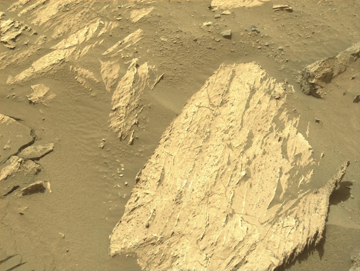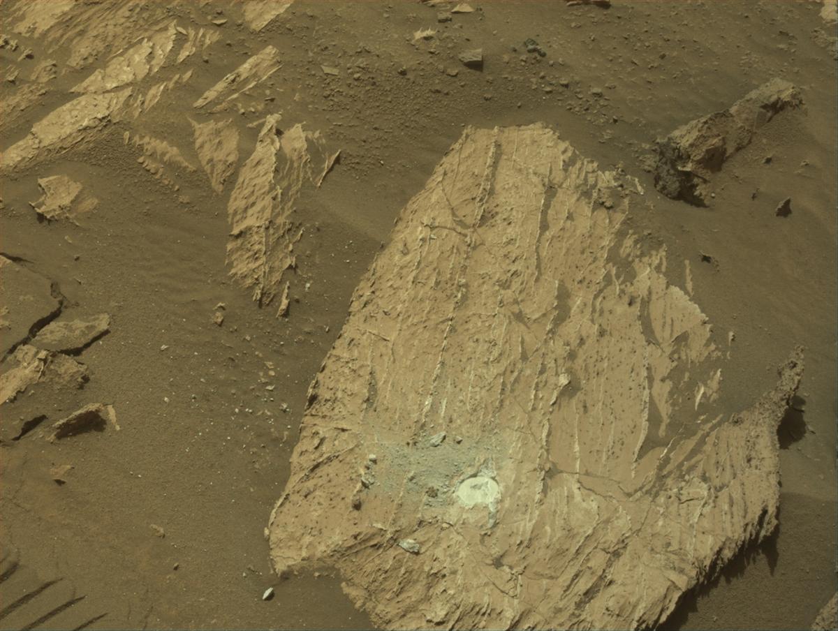 Уточнение. Сегодня ровер сделал абразивное пятно в камне, который находится слева, а в камне справа он сделал абразивное пятно ранее, когда направлялся к склону. Надеюсь, что найду, когда это было сделано. Сегодняшний снимок:
