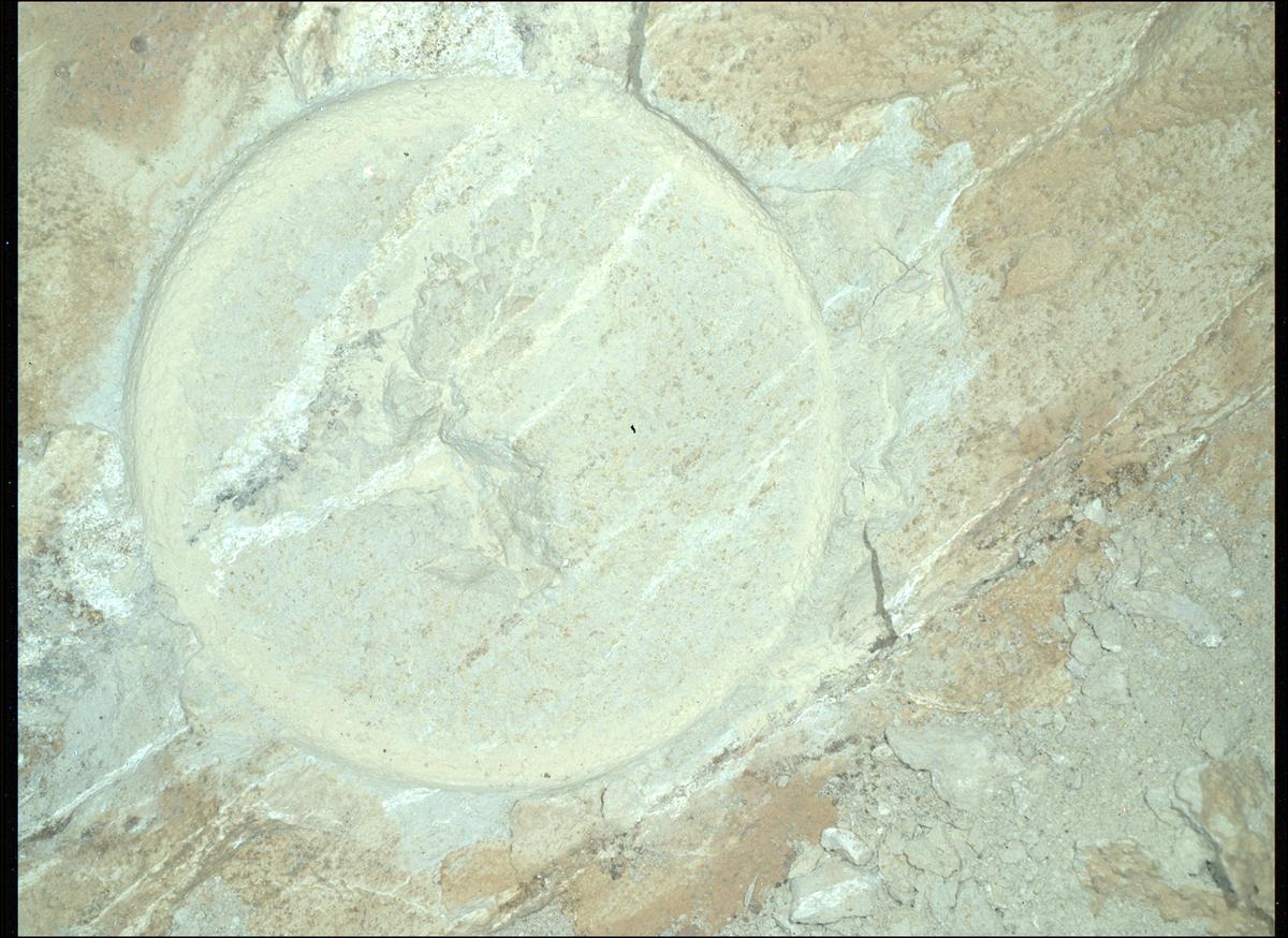 Возможно Perseverance в двух местах ободрал фрагменты нового камня своим плоским сверлом для последующего изучения? Или в нижней части полоса белой породы внедренная в материал камня?