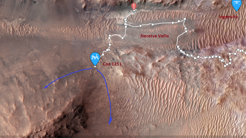 Посмотрим на карту М20 за 1251 сол (27 августа), куда поедет ровер в следующие дни (солы), налево или направо? Загадка.