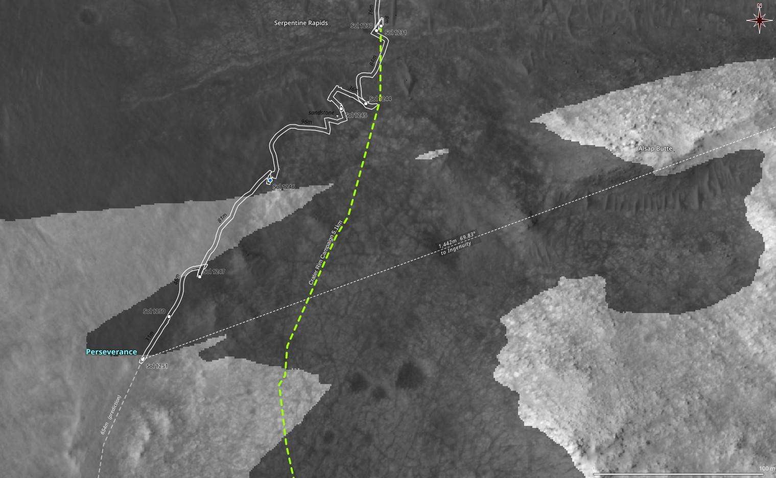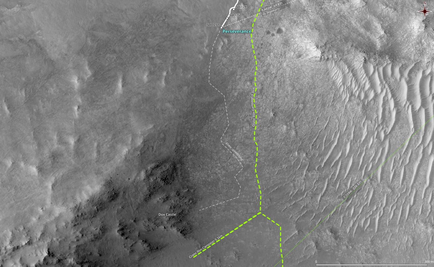 На сайте НАСА вчера появилась статья о начале кампании на краю (на ободе) кратера Езеро. Из нее мы узнаем в том числе, что холм, который закрывает вид на местоположение вертолета Ingenuity (до которого от ровера  ~1400 метров) называется Alsap Butte - Алсап Бьют - что означает Холм Алсапа, а первая большая стоянка будет в районе Замка Докс - Dox Castle.
