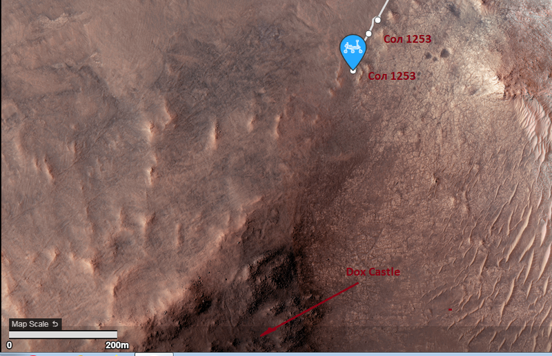 Сегодня, 29 августа (1253 сол), ровер проехал около 3 метров, если точнее, согласно JSON "dist_m": 3.158,  он подъезжает к первому месту стоянки по пути к краю Езеро - Dox Castle
