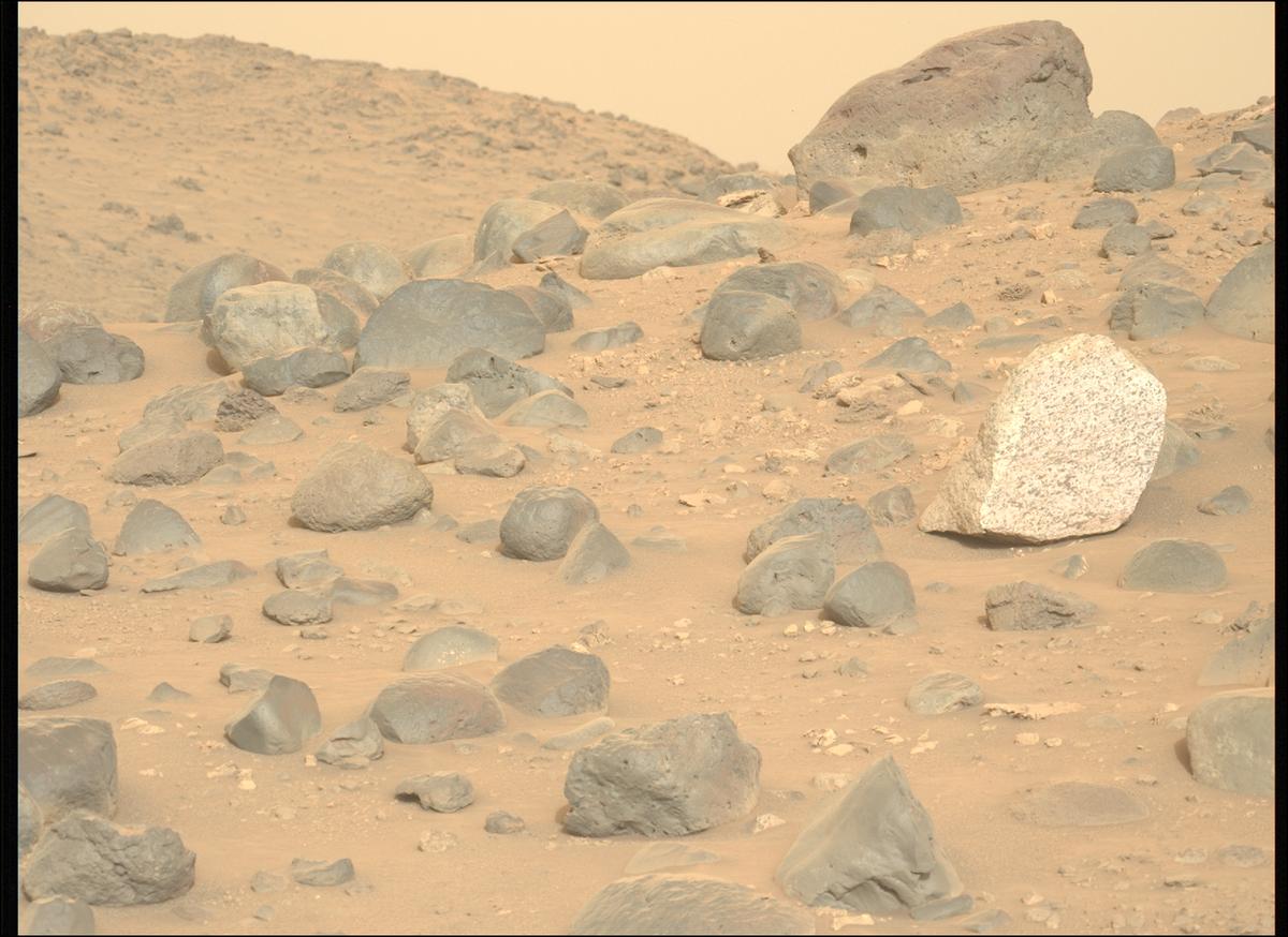 Пришло время вспомнить былое. Когда весной 2024 года ровер пересекал сухое русло Неретвы Валлис направляясь с южного берега на северный в район Bright Angel, 27 мая 2024 на 1162 сол на пути встретился холм позже названный Mount Washburn - гора Вошберн. На этом холме в окружении темных камней был один белый (Atoko Point) с темными вкраплениями. Так он выглядит без обработки: