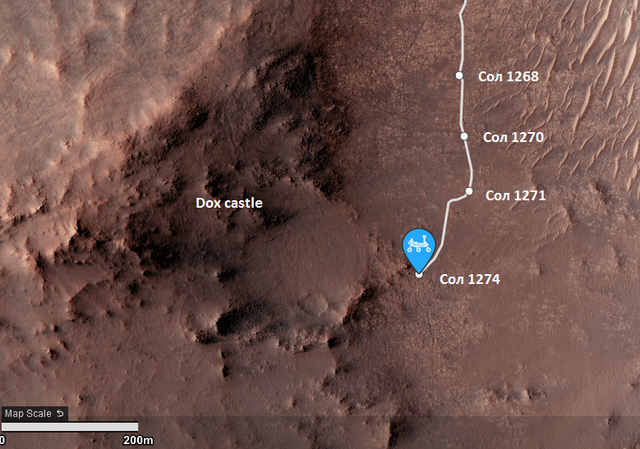 Итак, в 1274 сол ровер проехал согласно JSON  "dist_m": 155.119. Он находится на высоте  "elev_geoid": -2180.516357 поднявшись с 1271 сола ("elev_geoid": -2204.57959) на ~24 метра. Положение ровера теперь таково: