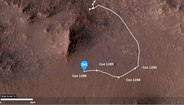 NASA/JPL только сейчас выложило снимки с сегодняшней трассы, обновленной карты М20 и таблицы JSON пока нет, поэтому воспользуемся картой наблюдателя 65dBnoise. Согласно его оценки ровер  уменьшил скорость ( потом увидим снимки следов и более менее станет понятно, почему) . Сегодня, 2 октября на 1286 сол ровер проехал около  19-20 метров. Наблюдатель 65dB пишет час назад: