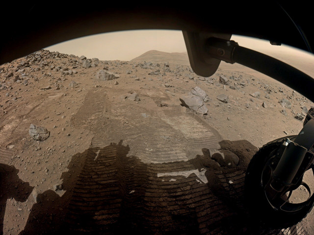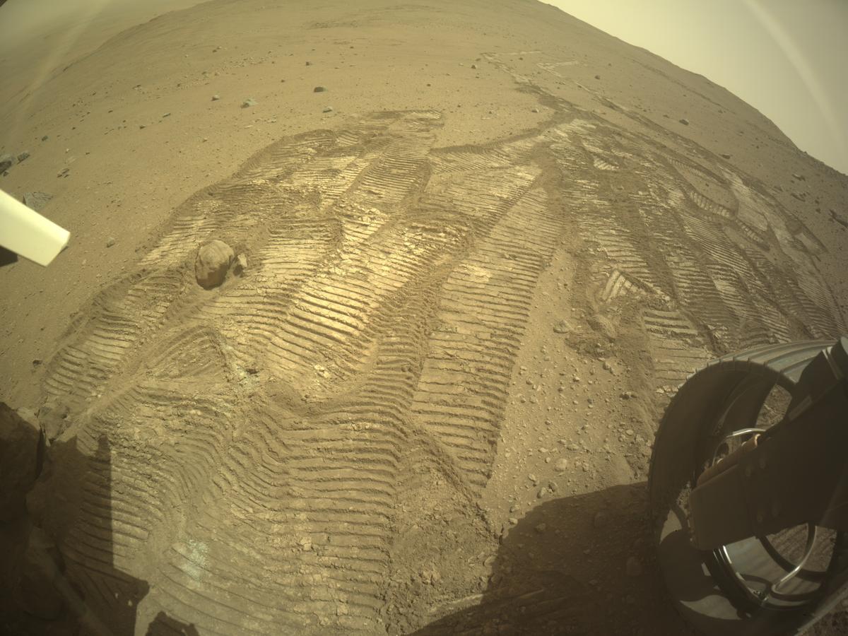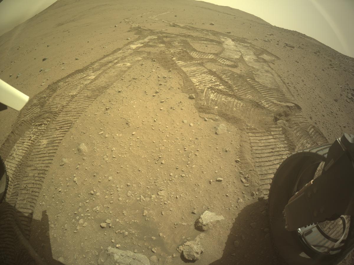 ЦитироватьМарсоход НАСА Mars Perseverance получил это изображение области за собой с помощью встроенной задней правой камеры для предотвращения опасности - Rear Right Hazard Avoidance Camera.