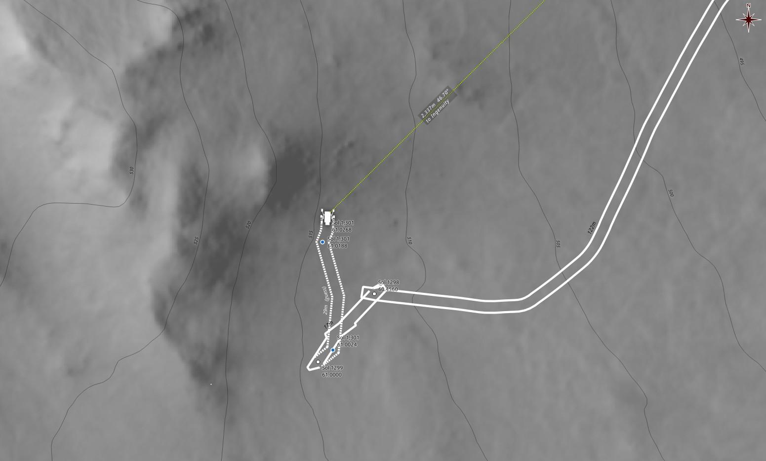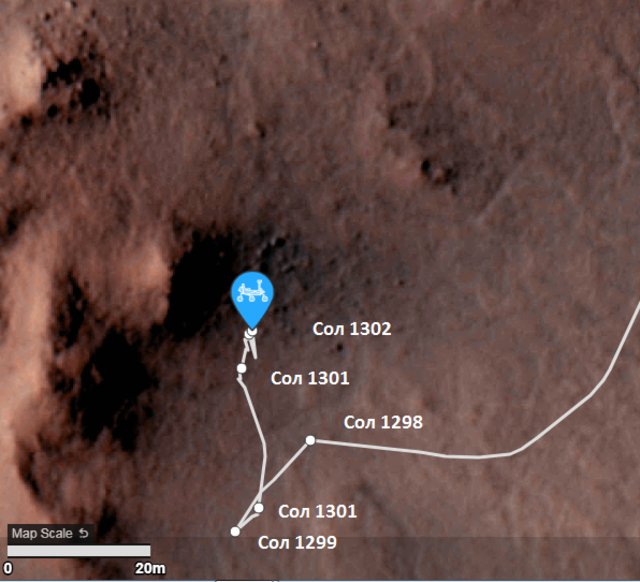 Пришли данные за 1302 сол (18 окт. 2024), согласно JSON ровер проехал "dist_m": 7.655, в результате он здесь: