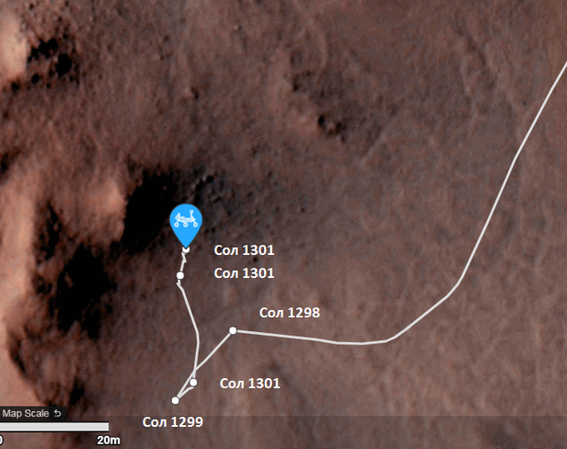 Согласно таблицам разница по высоте на которой находился ровер с 1298 сола по 1301 сол невелика - в пределах 1 метра,  это площадки рядом с холмами. Согласно таблицам ровер за 17 октября - 1301 сол проехал "dist_m": 31.952 и оказался здесь: