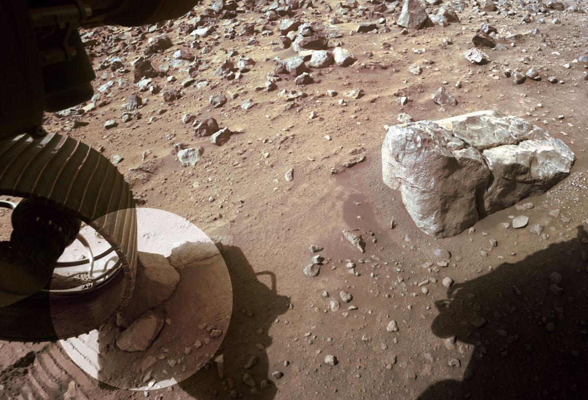 О-о-о! Левое переднее колесо #Perseverance уперлось в камень. Это может создать проблемы с устойчивостью, если ровер будет истирать или брать образцы целевой породы.