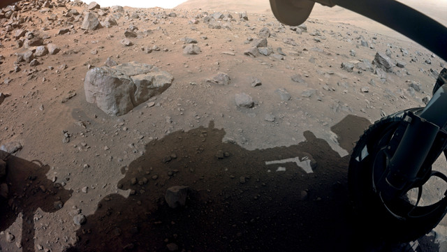ЦитироватьМарсоход НАСА Mars Perseverance получил это изображение с помощью правой навмгационной камеры (Navcam)/ Камера расположена высоко на мачте ровера и помогает в управлении.