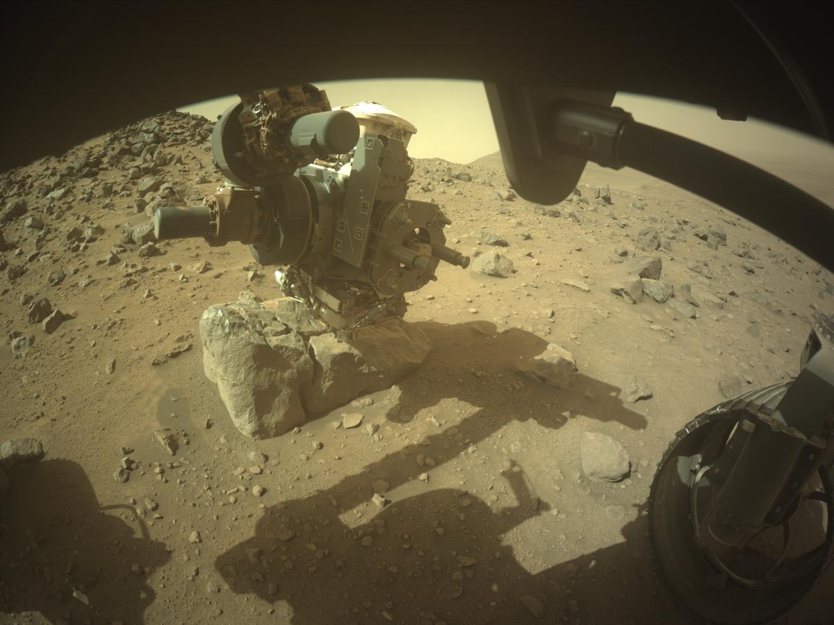 ЦитироватьМарсоход НАСА Mars Perseverance получил это изображение с помощью камеры SHERLOC WATSON, расположенной на турели на конце роботизированной руки марсохода.