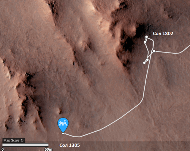 Пришла обновленная карта NASA/JPL M20 за 1305 сол, в настоящее время марсоход находится здесь: