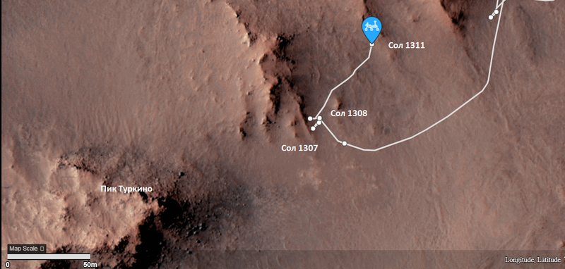 Между тем пришло обновление карты NASA/JPL M20  и таблиц JSON за 1311 сол ( 27 октября ). Из них (из таблиц) мы узнали, что ровер проехал в обратную сторону "dist_m": 61.933, при этом он опустился по сравнению с 1308 солом на 6,7 метра: