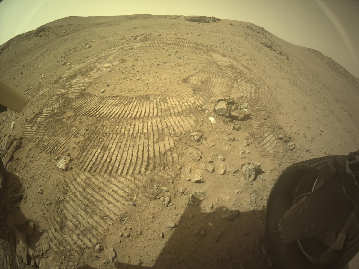 Марсоход НАСА Perseverance прокладывает крутой маршрут вверх по западной стене кратера Езеро с целью достичь вершины в начале декабря. Во время подъема марсоход не только сделал снимок внутренней части кратера Езеро, но и запечатлел следы, которые он оставил после пробуксовки колес на пути.