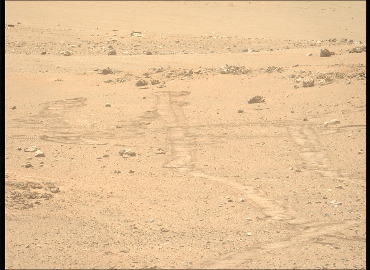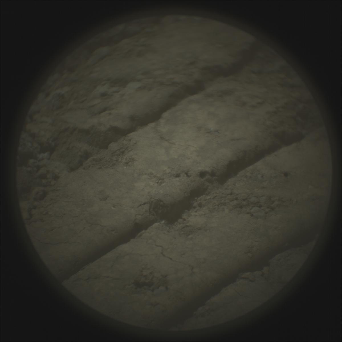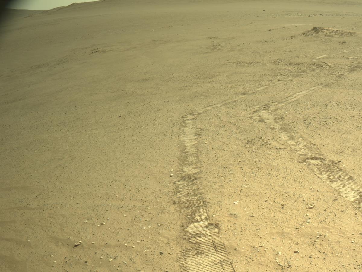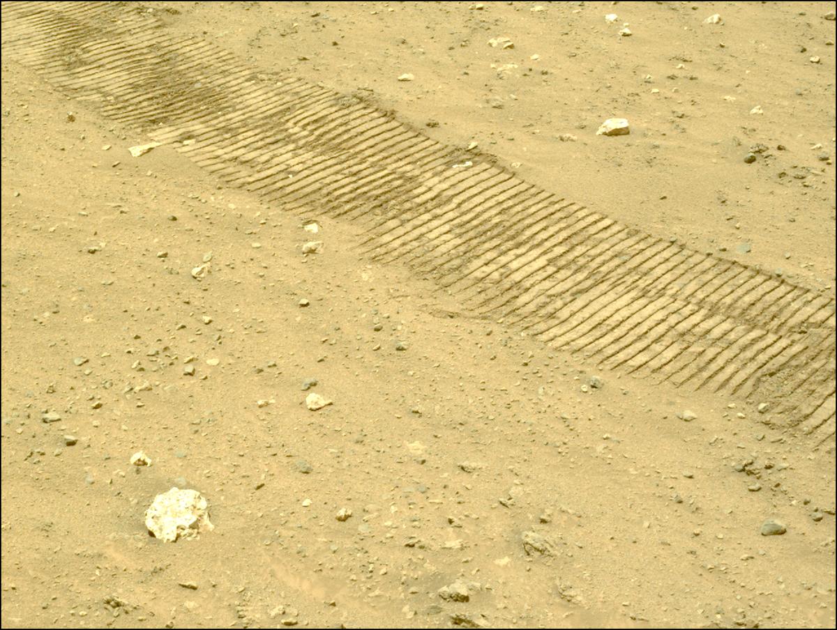 Следы ровера, исчезающие вдали, вздыбили реголит (разрушенные породы и песок) на поверхности, что свидетельствует о сильном скольжении. Края следов не ровные и не гладкие, что указывает на поперечное скольжение во время движения. На менее скользкой местности следы имеют четко очерченные линии от грунтозацепов на колесах ровера.