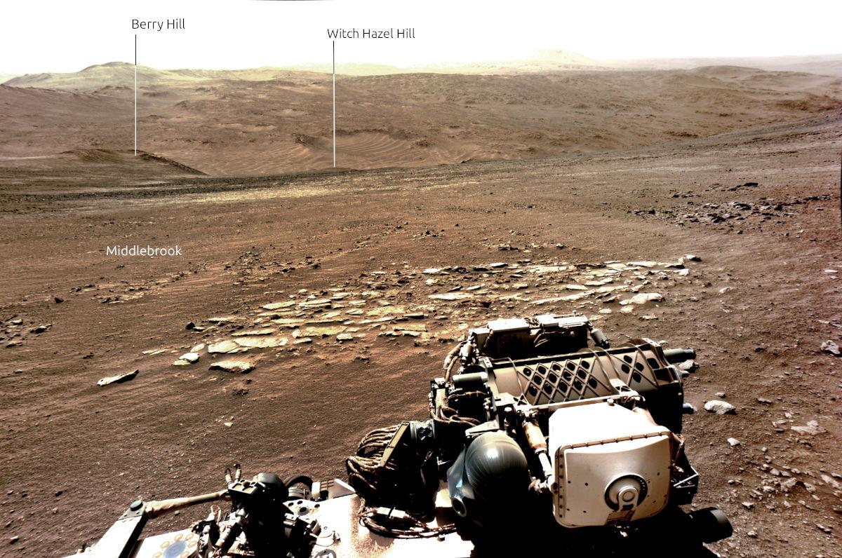 Примечание. Ровер сделал эту съемку, посмотрев в обратную сторону, в сторону Lookout Hill , то есть Смотрового Холма, который является самым высоким на ободе кратера Езеро в этом районе.
