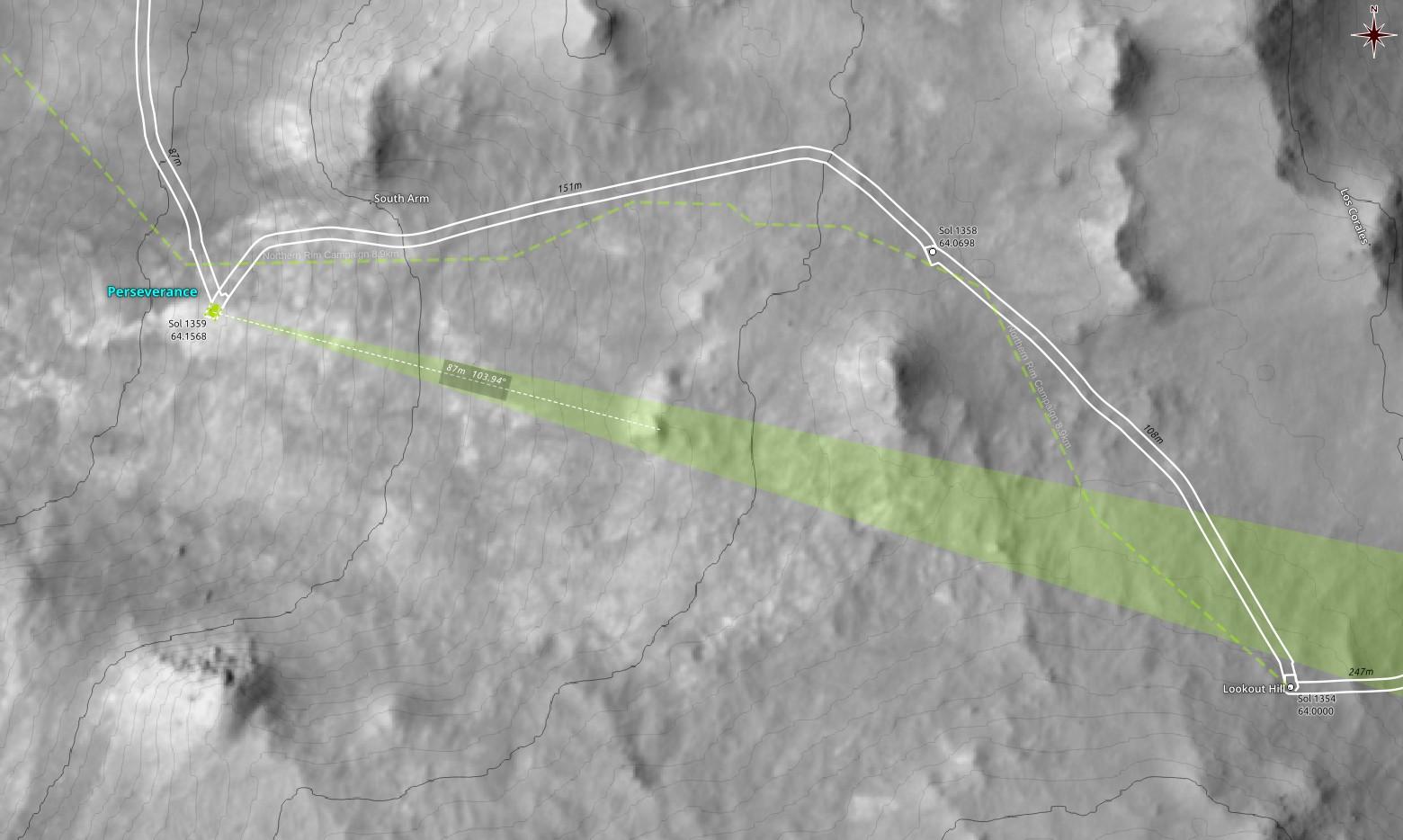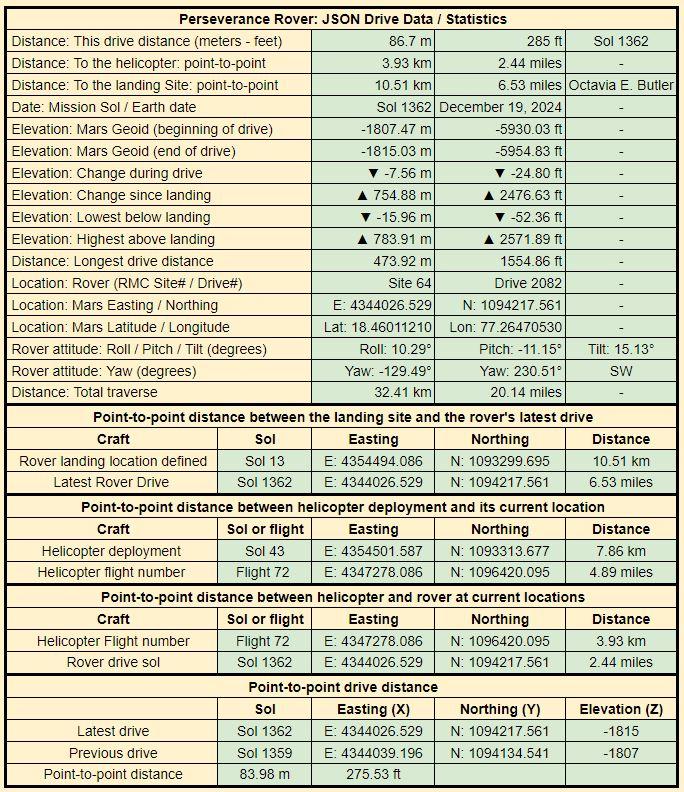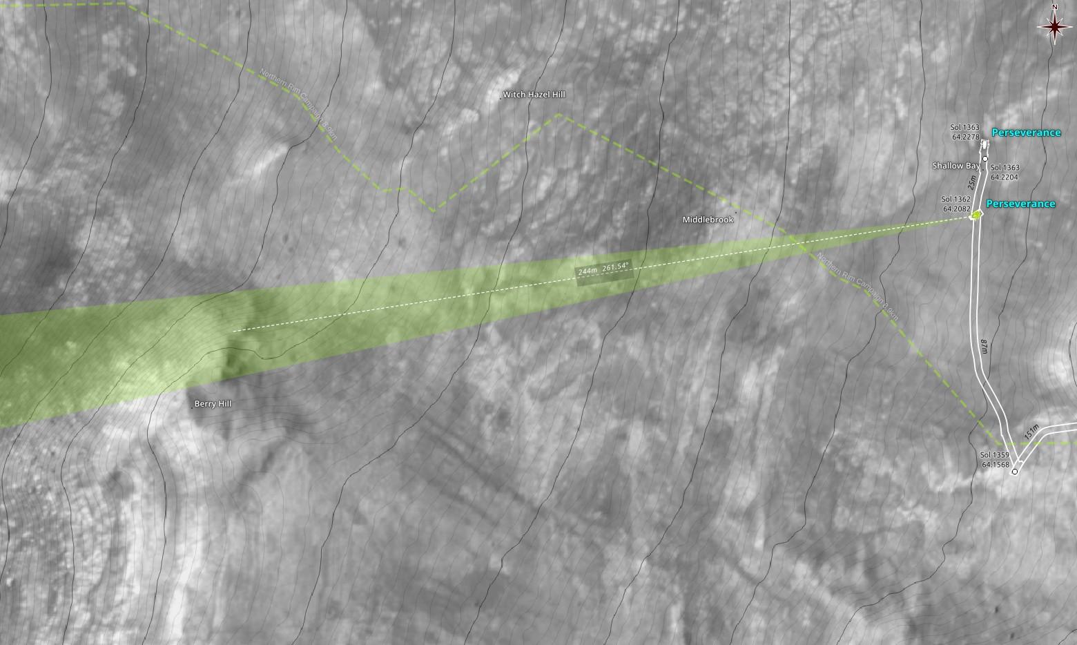 До вертолета 19 декабря (1362 сол) было 3,93 км (от точки к точке), связь между ровером и вертолетом прервалась 21 ноября 2024 год , а чуть позже ровер перевалил на внешнюю часть кратера Езеро и вертолет вышел из прямой видимости. Вертолет находится внутри кратера, теперь связь потеряна навсегда.