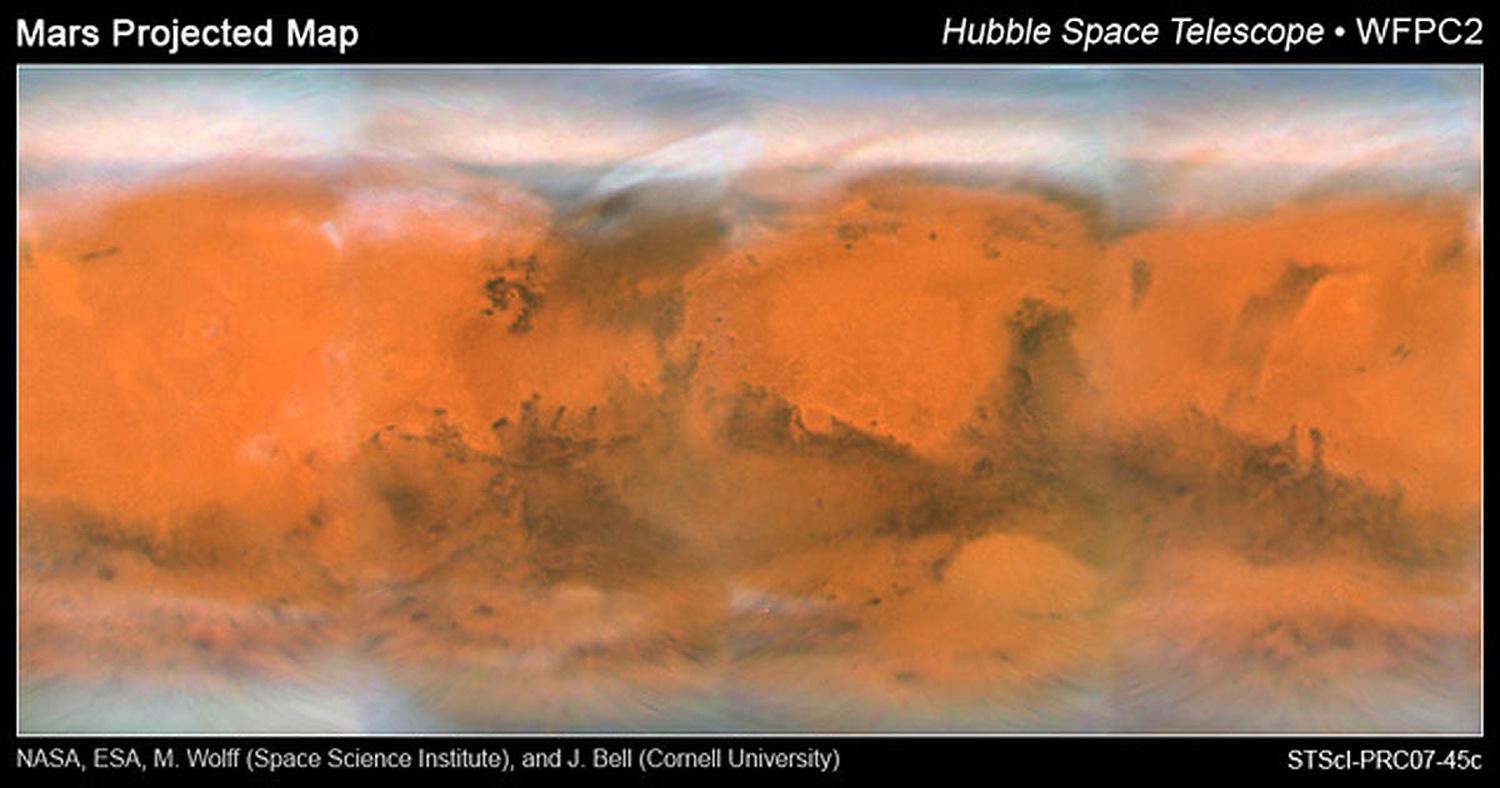 Чтобы понять, как Скиапарелли разработал свою схему названий, нам нужно немного перевернуть сознание. Начнем с карты Марса - давайте воспользуемся современной картой, полученной с помощью космического телескопа «Хаббл». Но Скиапарелли видел Марс не таким...  #карты #Марс #Хаббл