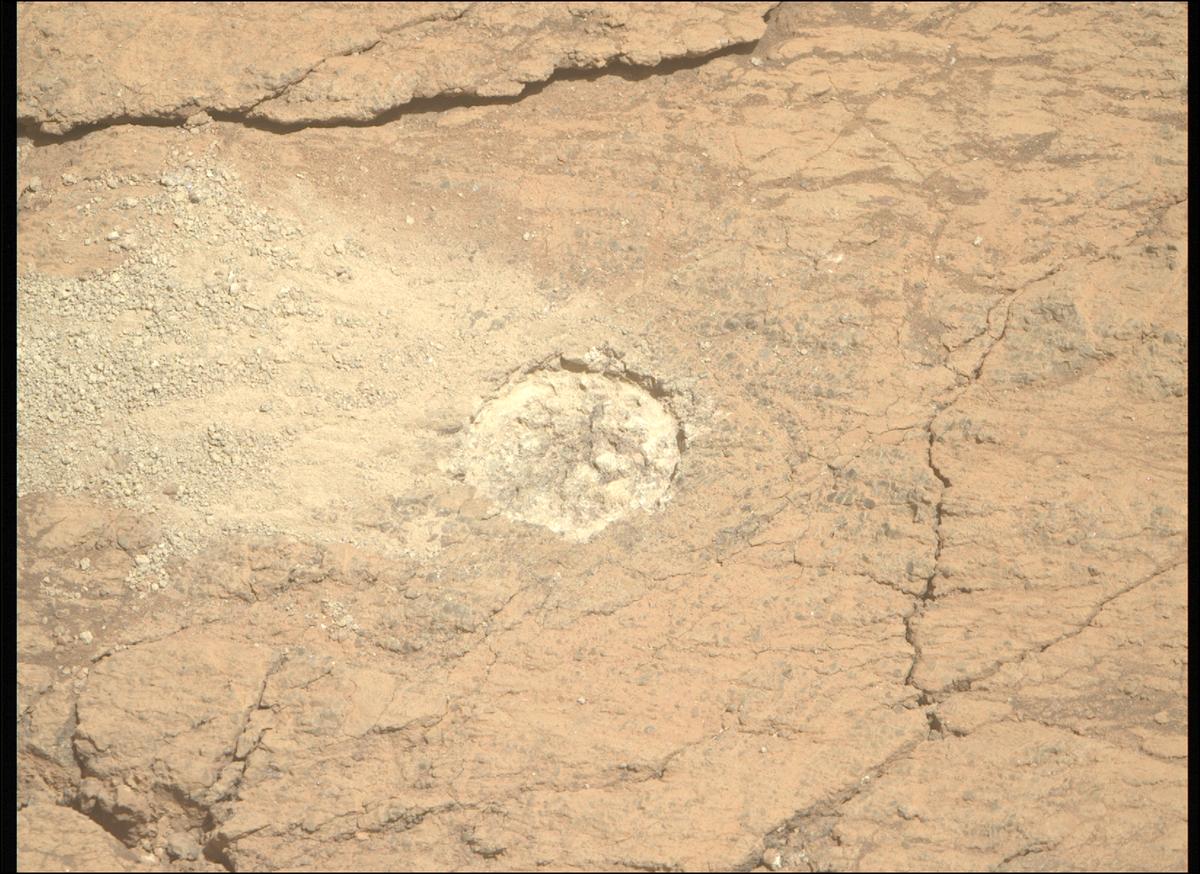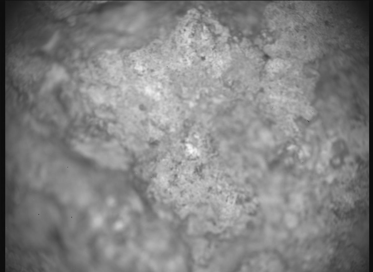 Сегодня, 3 января 2025 на 1377 сол Ровер продолжил исследование материала  абразивного пятна, здесь камера SHERLOC WATSON снимает часть пятна, граница пятна не видна. Диаметр всего пятна 5 см, его глубина до 1 см.