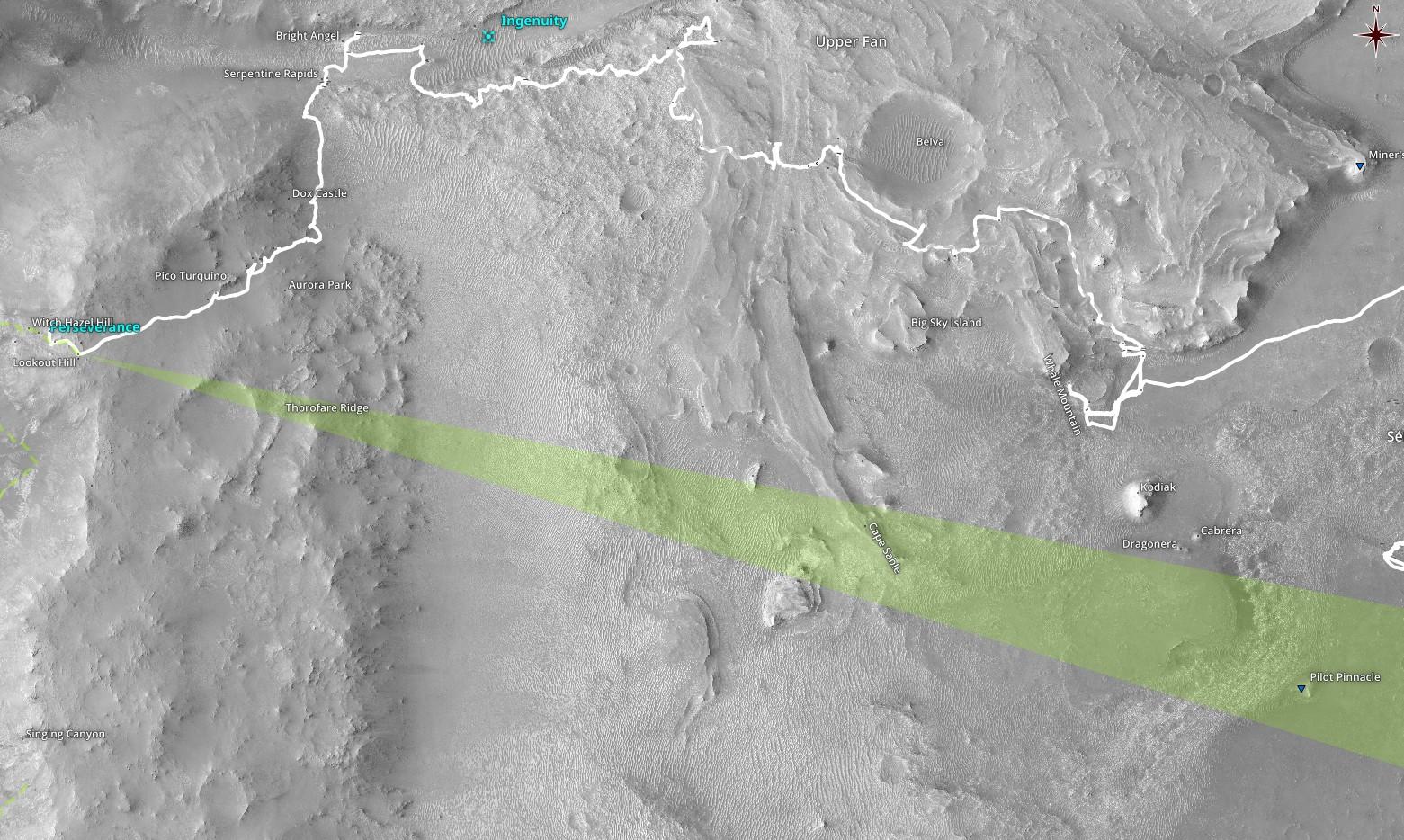Карта, показывающая поле зрения камеры MastCam-Z аппарата Perseverance, когда она сделала снимок выше, а также топонимы и маршрут марсохода от Три Форкс до вершины западного обода кратера Езеро.