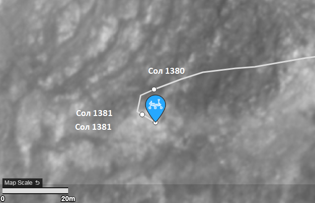 Тем не менее пришли данные о движении ровера 7 января 2025 (до пожара в районе расположения JPL) или на 1381 сол. Он совершил короткий трек. Согласно обновленным данным JSON ровер проехал  "dist_m": 16.434, его положение по высоте изменилось незначительно - он поднялся за время движения на ~1метр. Ровер в настоящее время находится здесь: