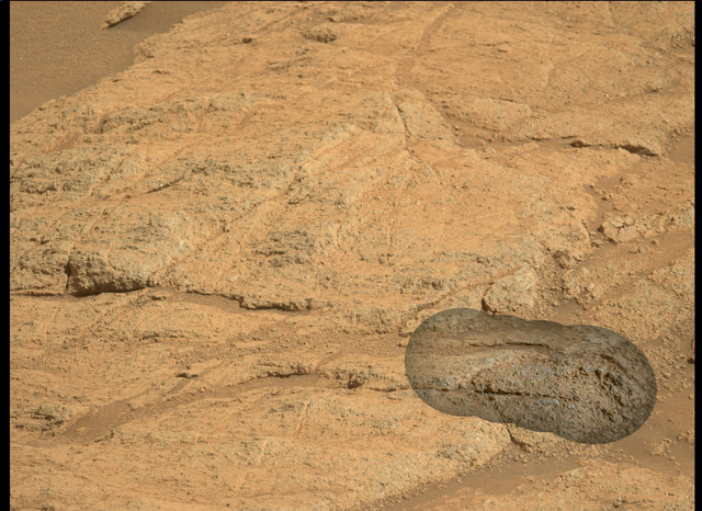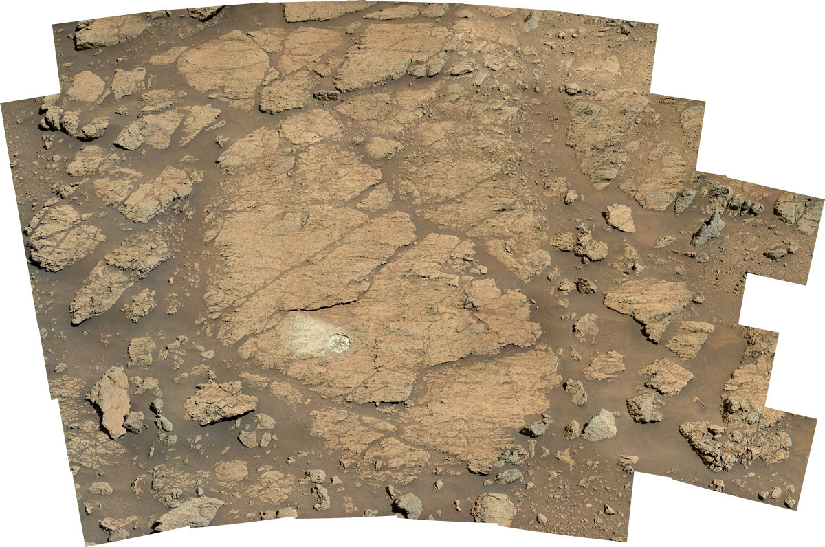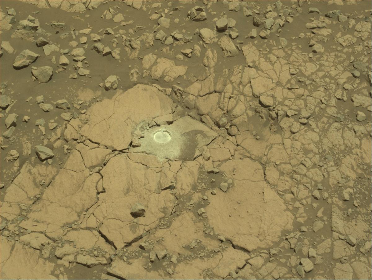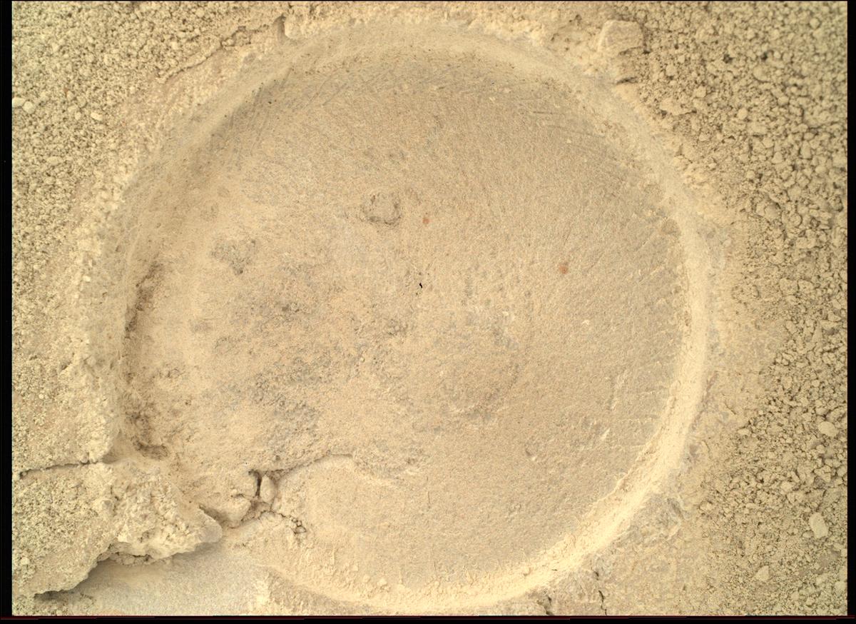 Новое абразивное пятно для исследований породы. Снимает камера  WATSON, исследует прибор  SHERLOC :