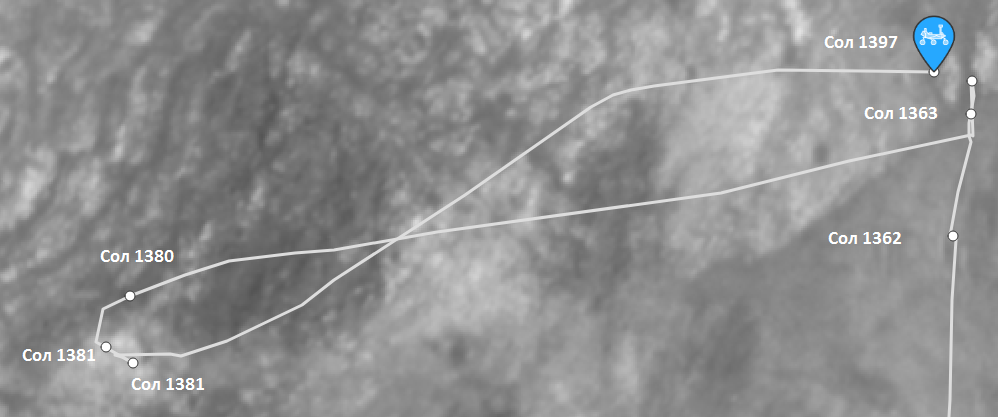 Уточнил, местность (образование) где ровер находился на 1363 сол  ( несколькими страницами ранее) и где находится сейчас ( 1397 сол)  называется Shallow Bay ( Мелководный залив). Судя по всему он вернулся из за  породы, которую обнаружил ранее , в 1363 сол.