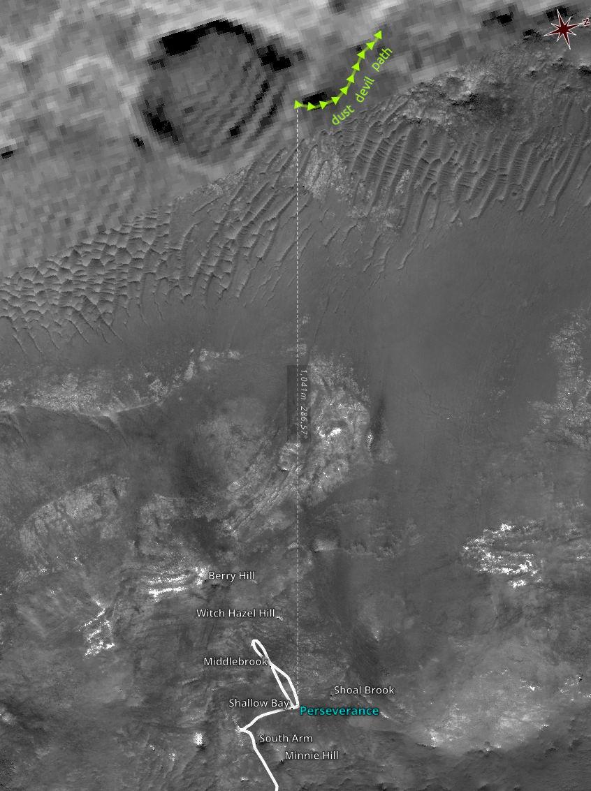 В отличие от карты NASA/JPL M20 здесь карта с трассой ровера за 24 января (1397 сол) повернута. Объяснения в тексте наблюдателя я выделил.