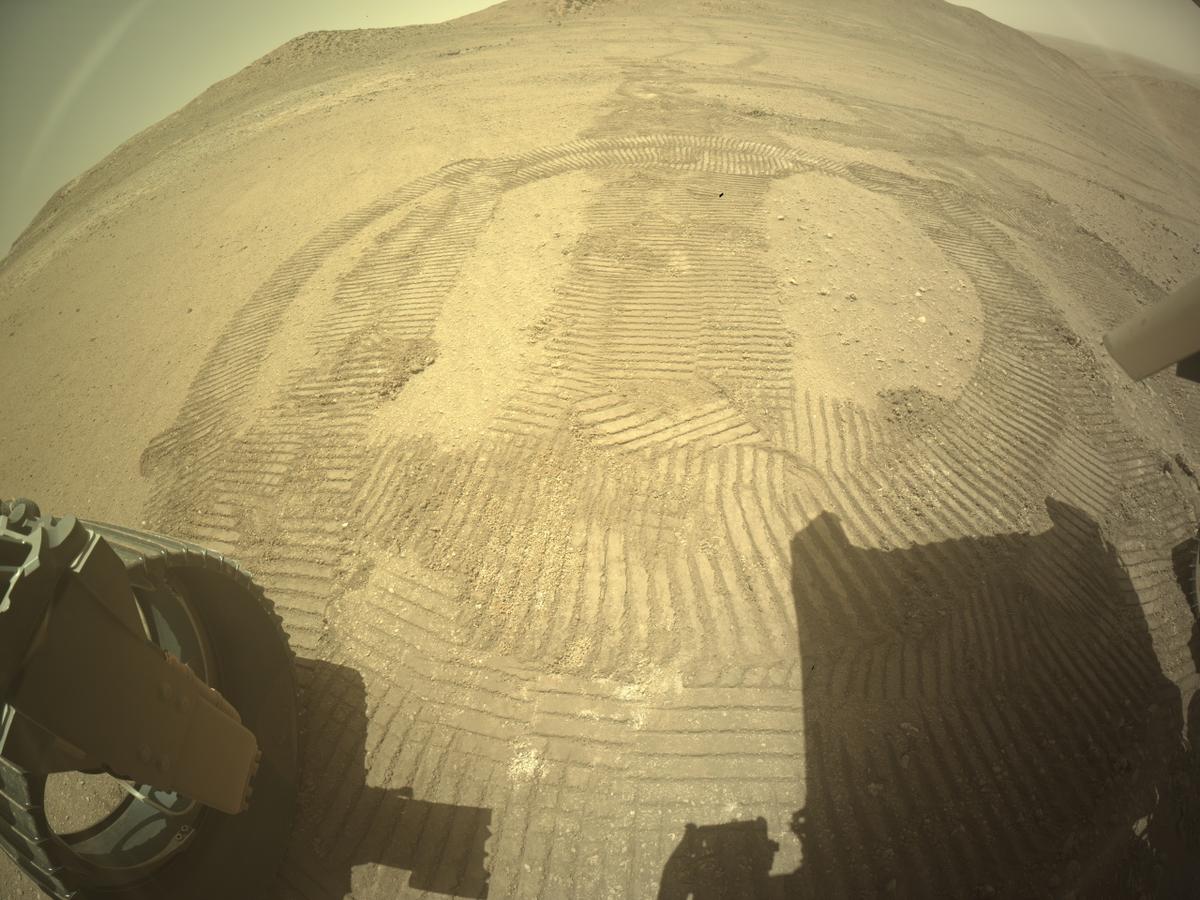 ЦитироватьМарсоход НАСА Mars Perseverance получил это изображение области за собой с помощью встроенной задней левой камеры для предотвращения опасности - Rear Left Hazard Avoidance Camera..