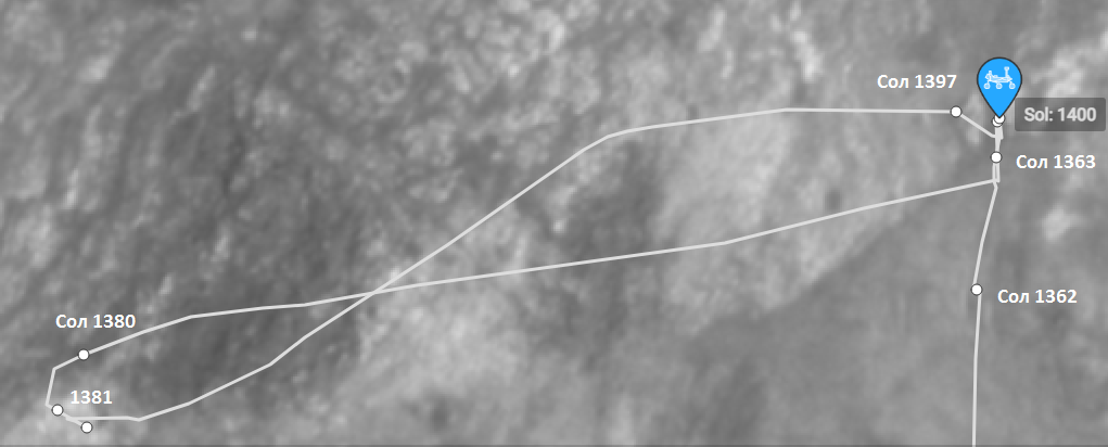 Сегодня (в 1400 сол) ровер переместился на "dist_m": 10.66 согласно JSON и находится в точке Sol:1400: