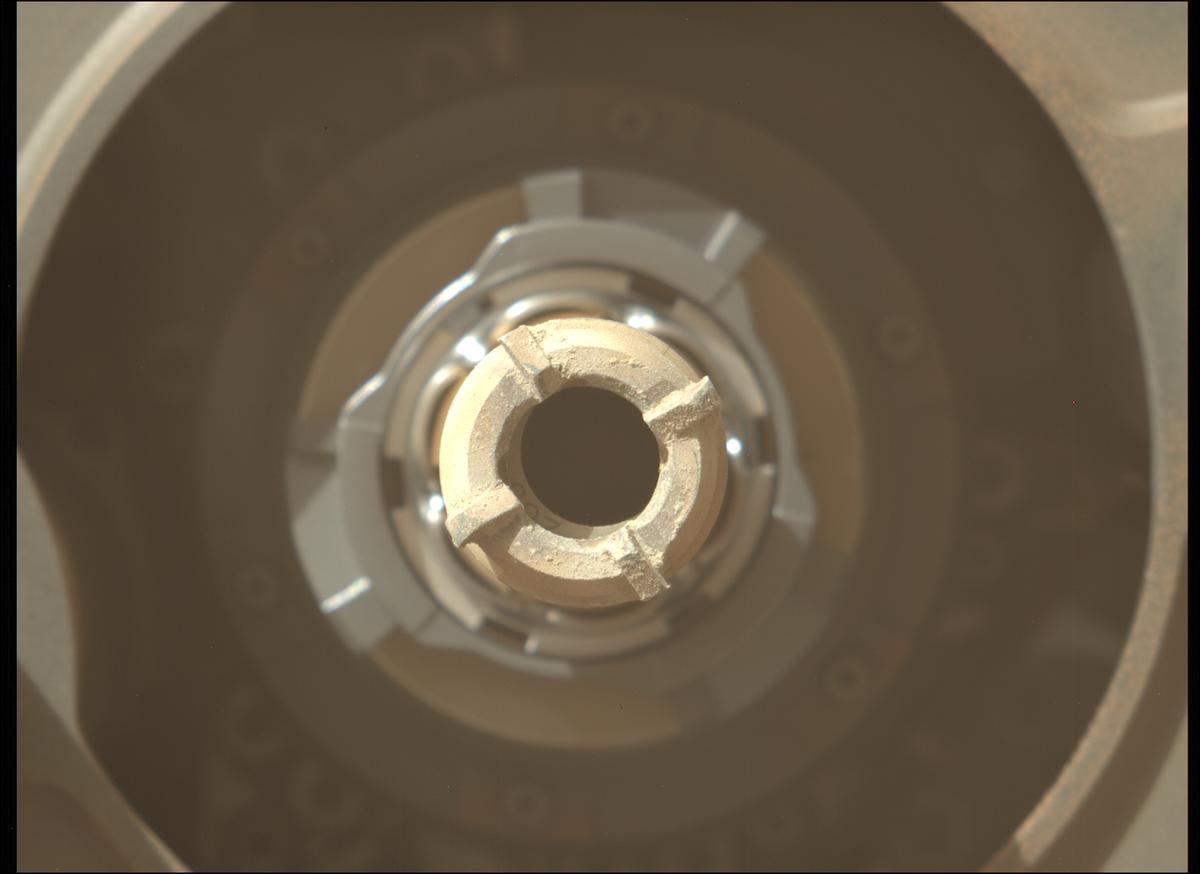 ЦитироватьМарсоход НАСА Perseverance получил это изображение с помощью встроенной камеры системы кэширования образцов (CacheCam), расположенной в подбрюшье марсохода. Она смотрит вниз, в верхнюю часть пробирки с образцами, чтобы сфотографировать крупным планом отобранный материал и саму пробирку в процессе ее подготовки к герметизации и хранению.
