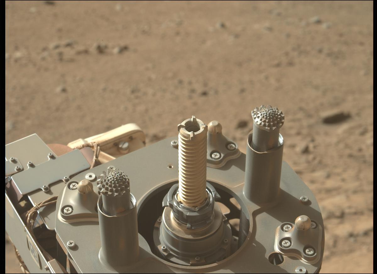 ЦитироватьМарсоход НАСА Mars Perseverance сделал этот снимок с помощью встроенной камеры системы кэширования образцов (CacheCam), расположенной в подбрюшье ровера. Она смотрит вниз, в верхнюю часть пробирки с образцами, чтобы сфотографировать крупным планом отобранный материал и саму пробирку в процессе ее подготовки к герметизации и хранению.