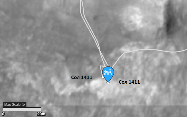 Сегодня, в 1411 сол, ровер совершил небольшой пробег. Согласно таблице JSON  он проехал "dist_m": 9.971 и теперь он здесь: