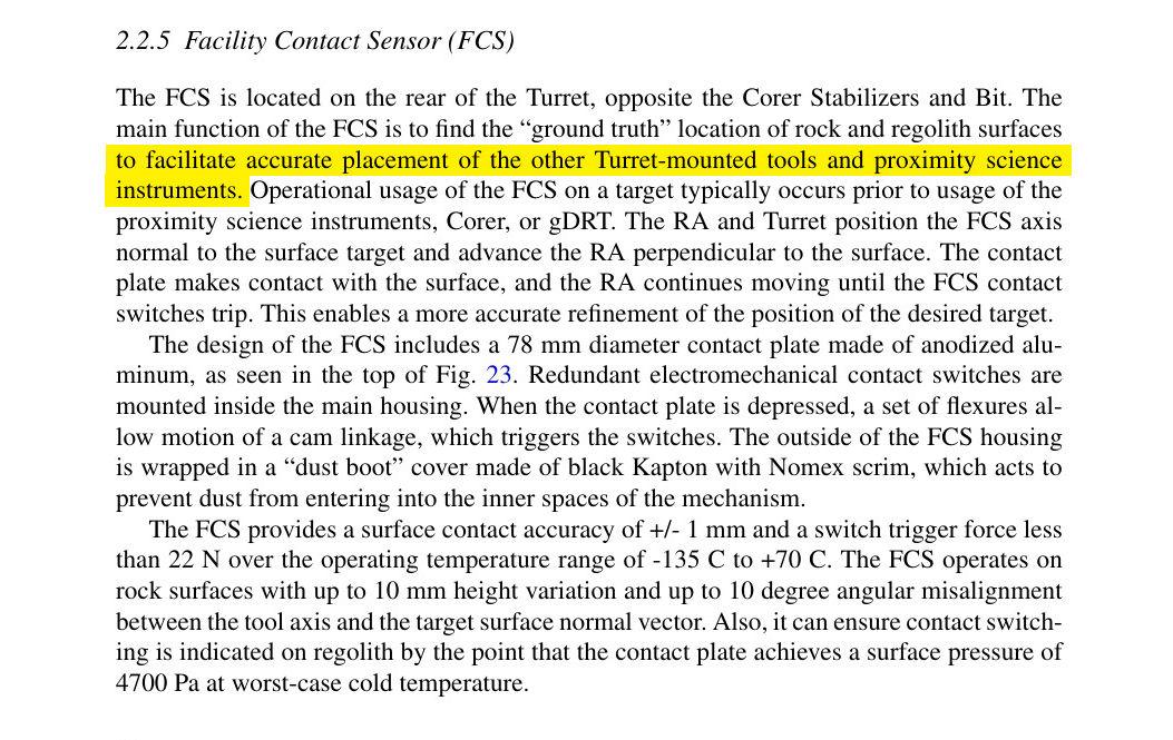 Как вчера предположил @PaulHammond51, наиболее правдоподобным объяснением «выравнивания» хвостов - "leveling" of the tailings , наблюдаемого на снимках yestersol (во вчерашний сол, прим. мое), является нормальная работа датчика контакта с объектом Facility Contact Sensor (FCS), который используется для поиска «истинного положения дел» на местности.
