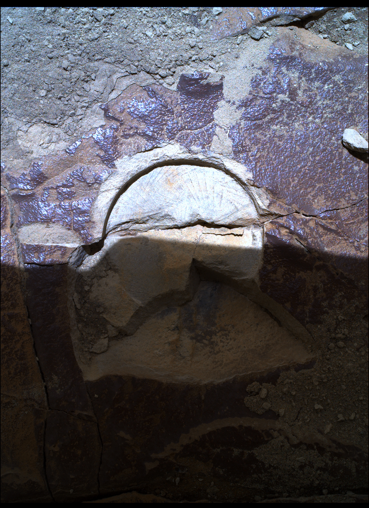 Есть один ньюанс - Areo обрабатывает зеленоватые снимки снятые навигационными камерами Navcam, снимки сделанные камерами Mastcam-Z ( они красноватые) не обрабатывает, сотрудники честно пишут - не можем, а навигационные снимки - запросто. Обрабатывают и снимки снятые инженерными камерами Вот снимок абразивного пятна в исполнении Areo: