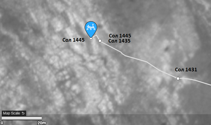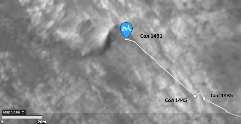 Пришла обновленная карта NASA/JPL М20 и согласно ей ровер проехал 20 марта на 1451 сол 45,83 метра и оказался здесь: