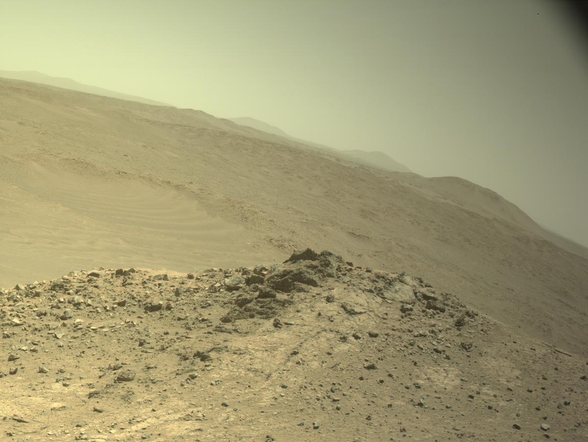 Впереди холм за которым слева внизу песчанные дюны. Снимает навигационная камера и поэтому в отличие от камер MastCam-Z увеличения нет, мы видим, что холм за 5 минут (см. выше) немного приблизился..