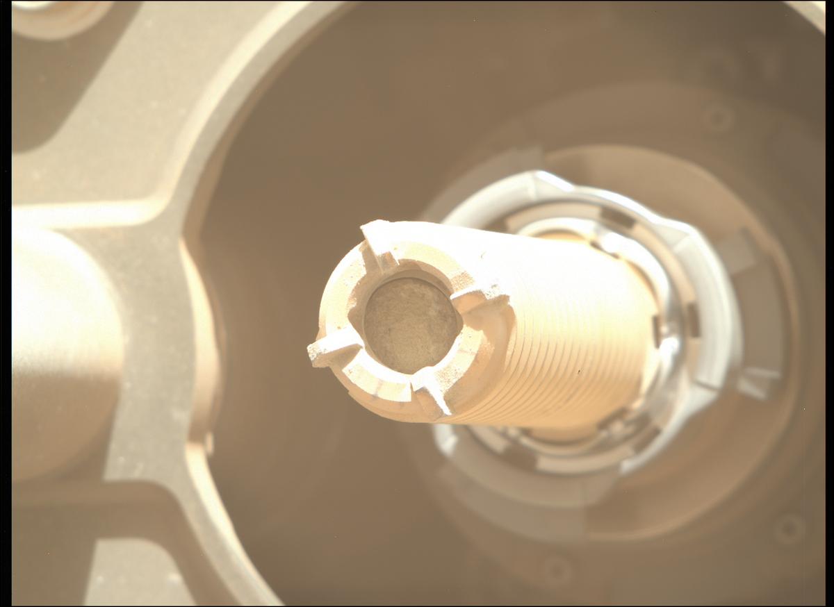ЦитироватьМарсоход НАСА Mars Perseverance сделал этот снимок с помощью встроенной камеры системы кэширования образцов (CacheCam), расположенной в подбрюшье ровера. Она смотрит вниз, в верхнюю часть пробирки для образцов, чтобы сфотографировать крупным планом отобранный материал и саму пробирку в процессе ее подготовки к герметизации и хранению.