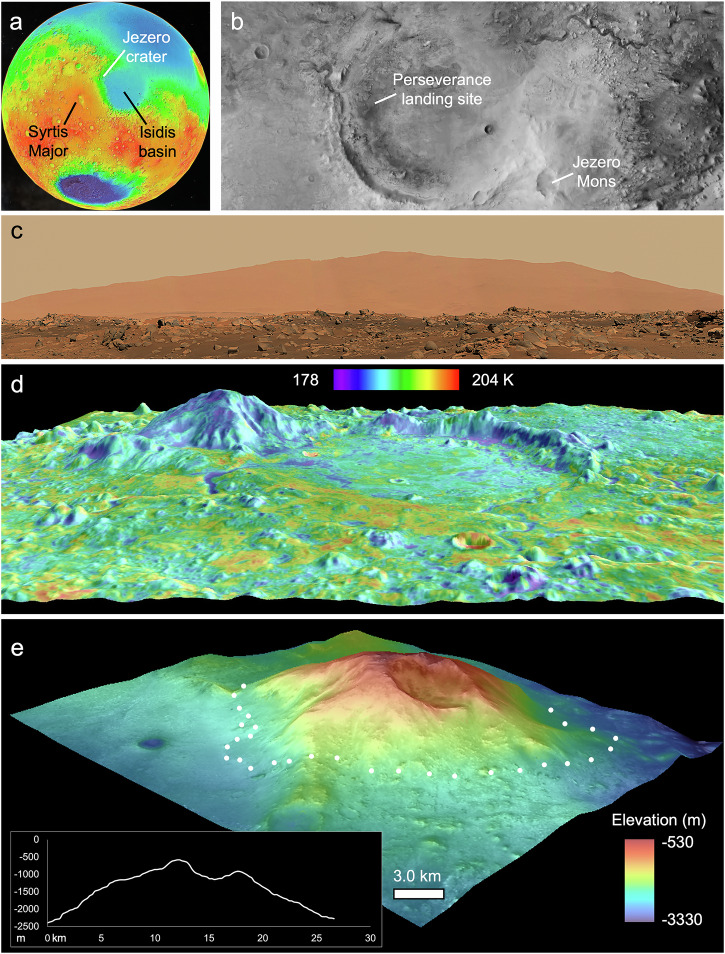Для масштаба: диаметр горы составляет ~21 км. a Топография восточного полушария Марса с изображением Езеро и других ориентиров, упомянутых в тексте. b Вид сверху (мозаика CTX) на кратер Езеро (D ~ 45 км). c Юго-восточный горизонт, вид с марсохода NASA Perseverance в западном кратере Езеро (панорама Mastcam-Z «Ван Зил Оверлук» -  Van Zyl Overlook- , снятая на 53–63-й сол). d Вид под углом с северо-северо-востока на кратер Езеро, на котором мелкозернистые материалы окрашены в синий и фиолетовый цвета, а более крупные и/или твёрдые материалы на окружающих его древних возвышенностях — в жёлтый и оранжевый (ночная инфракрасная мозаика THEMIS, раскрашенная по яркости дневного инфракрасного изображения THEMIS, с увеличенной в ~3 раза топографией; температурная шкала на основе изображения THEMIS I01664003). e Косой вид с юго-запада, демонстрирующий неровную форму кратера на вершине и возможные потоки, впадающие в кратер Езеро (видимые изображения CTX наложены на топографию MOLA, увеличены ~в 3 раза, раскрашены по высоте). Врезка — топографический профиль (увеличен ~в 3 раза) приблизительного поперечного сечения, видимого на панели d (трансект, начинающийся ~в 68° к востоку от центра кратера на вершине).