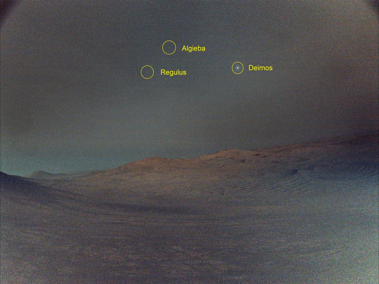 Низкая освещенность и длительная экспозиция добавляют цифровой шум, делая изображение туманным. Многие из белых пятен, видимых на небе, скорее всего, являются шумом, а некоторые - космическими лучами. Два более ярких белых пятнышка - это Регул и Альгиба, звезды в созвездии Льва.