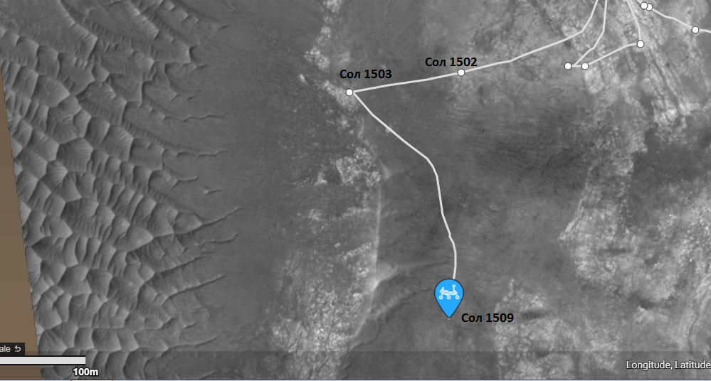 Сегодня, 19 мая, на 1509 сол, марсоход повернул налево и отправился на юг, согласно JSON он проехал