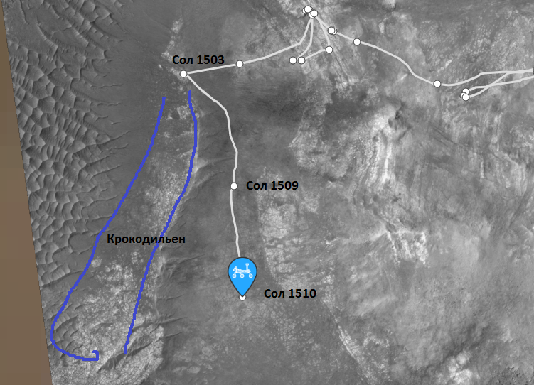 Марсоход движется на юг, а на западе предположительно находится древняя структура Крокодильен (Крокодил), которая представляет собой плато площадью около 30 гектаров со скальными обнажениями, расположенное ниже по склону к западу и югу от холма Витч-Хейзел -Witch Hazel Hill (уже проехали, прим.мое). На карте обозначен предположительный фрагмент Крокодильена, который уходит ниже на юг.