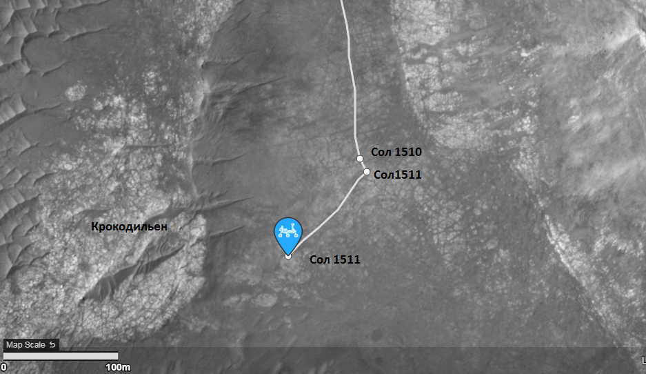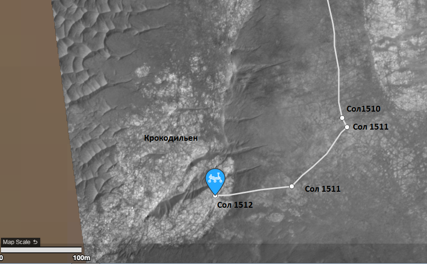 Согласно таблице JSON, ровер в 1512 сол, 22 мая 2025, проехал  "dist_m": 96.182 и при этом опустился на ~9 метров.