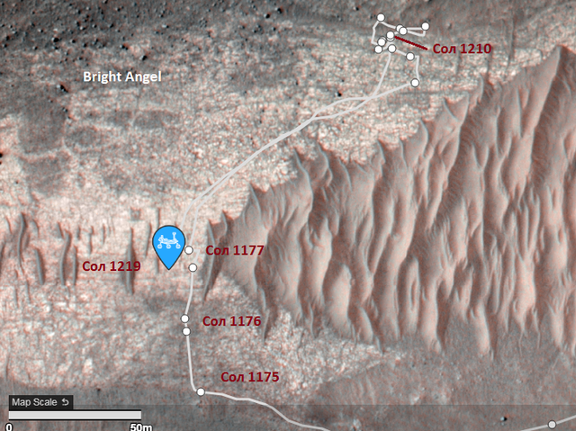 Ориентировочно ровер проехал сегодня ( 1219 сол) 135 метров на юго-запад. Маршрут проходил от точки ~1210 сол до точки 1219 сол. Судя по всему ровер движется в сторону южного берега древнего русла Неретвы.