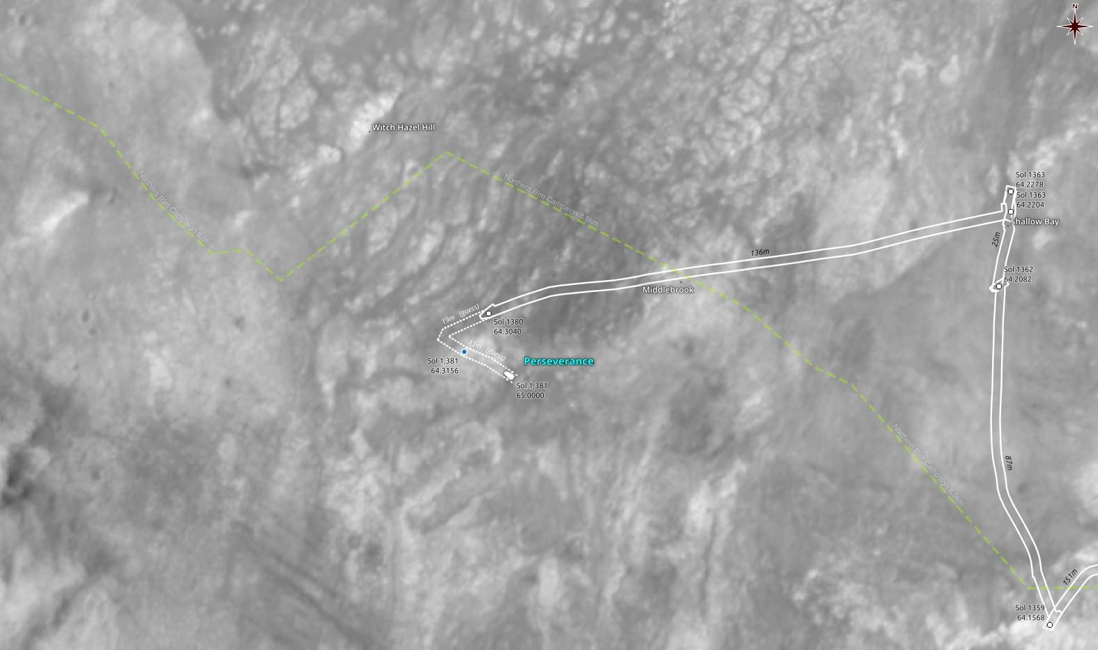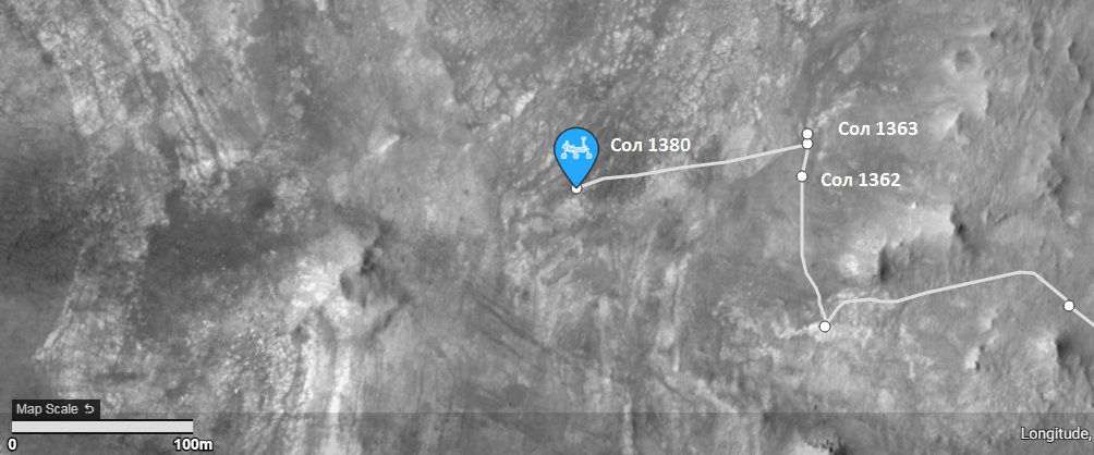 Пришла обновленная таблица JSON согласно которой ровер за 1380 сол (6 янв. 2025) опустился на ~34 метра и проехал при этом на запад "dist_m": 135.961. В настоящее время он находится здесь:
