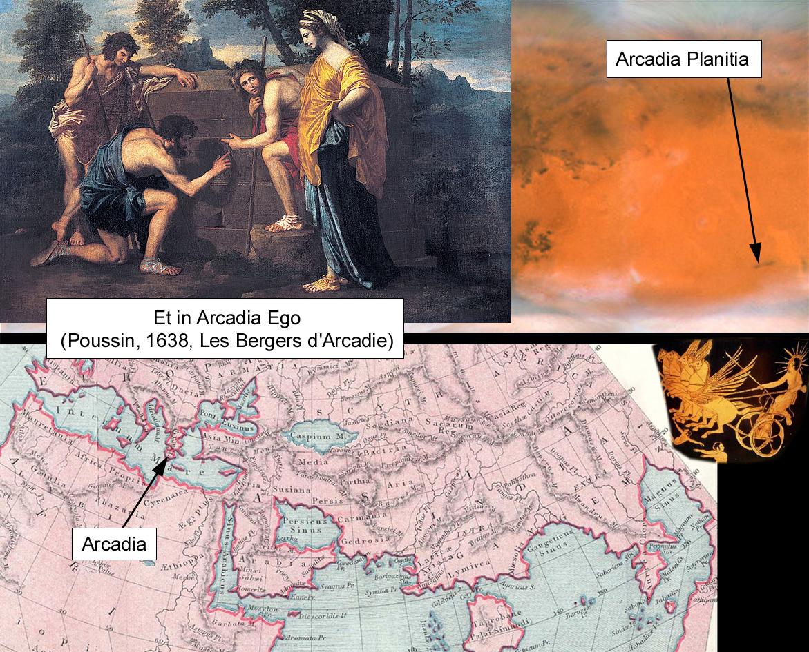 Сегодня последние 3 места в моей истории о названиях Марса. Начнем с Аркадии, бедной скалистой земли на юге Греции, где пастухи вели тяжелую жизнь, но городские жители считали их беззаботными и невинными по сравнению с развращенными жителями городов. На картине Пуссена изображены пастухи, читающие надпись на могиле: Et in Arcadia Ego (примерно "Я (смерть) также (или даже) в Аркадии"). Эта фраза стала знаменитой благодаря роману Дэна Брауна "Код да Винчи" и его любопытным предшественникам. #карты #Марс #Аркадия
